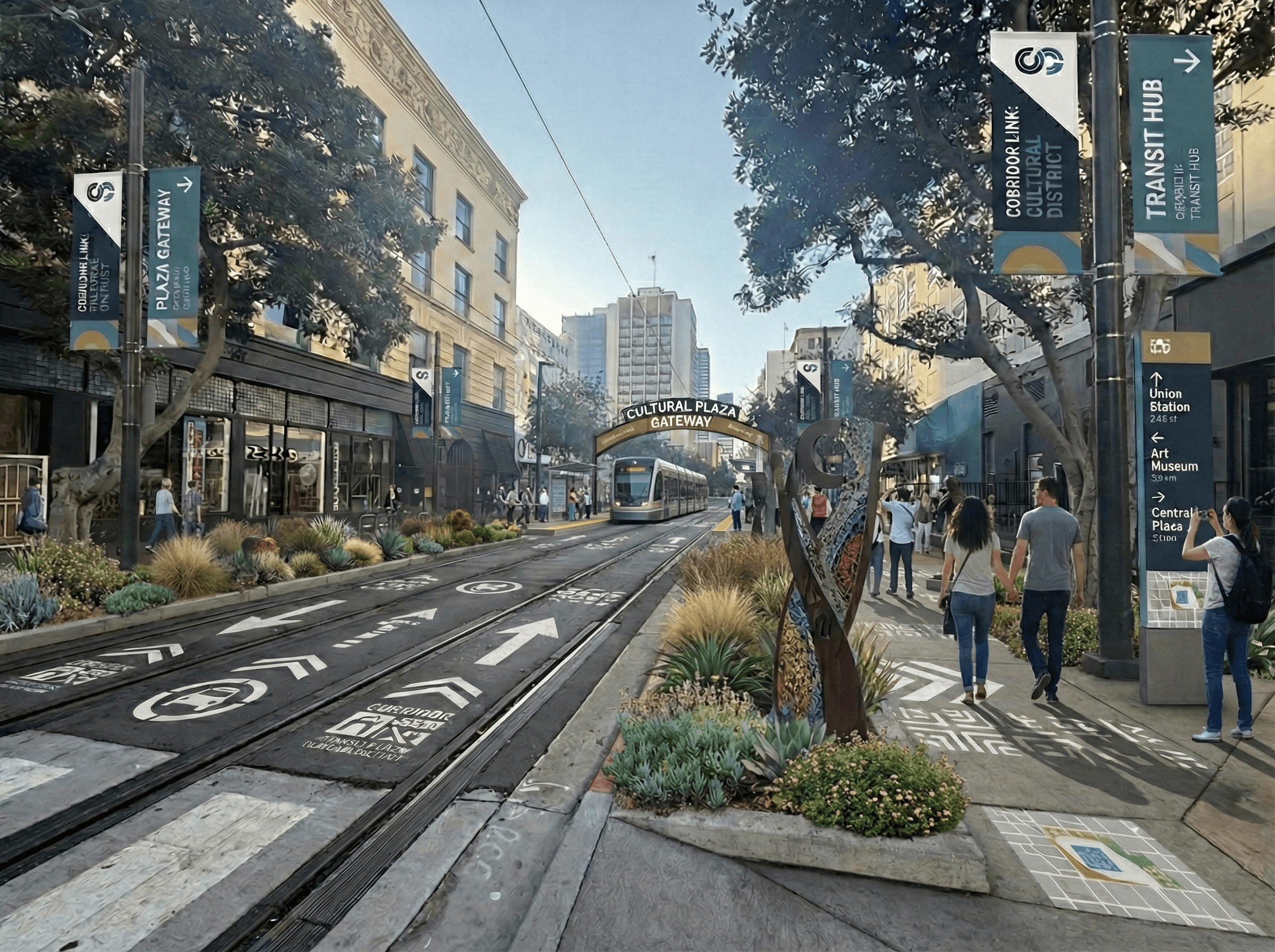 Anchors & Legibility: The corridor is envisioned as a defined journey bookended by "strong destinations at each terminus," such as cultural institutions or plazas that act as visual gateways . To connect these points, the plan implements a "consistent graphic language" for signage that is multilingual and inclusive, ensuring clear navigation for all transit users and pedestrians .